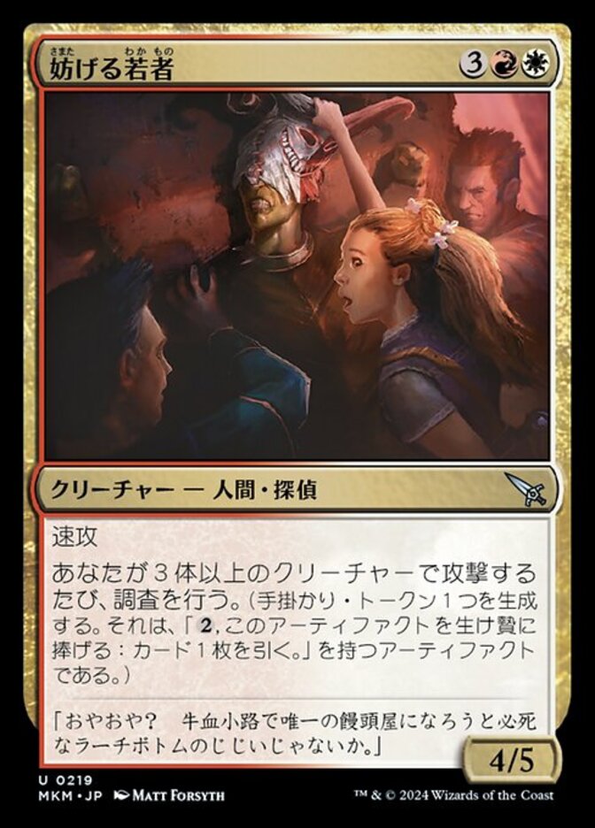 | Rules | Haste Whenever you attack with three or more creatures, investigate. (Create a Clue token. It's an artifact with ", Sacrifice this artifact: Draw a card.") |