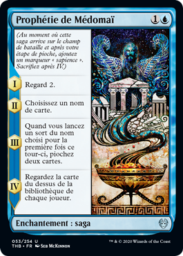 | Rules | (As this Saga enters and after your draw step, add a lore counter. Sacrifice after IV.) I — Scry 2. II — Choose a card name. III — When you cast a spell with the chosen name for the first time this turn, draw two cards. IV — Look at the top card of each player's library. |