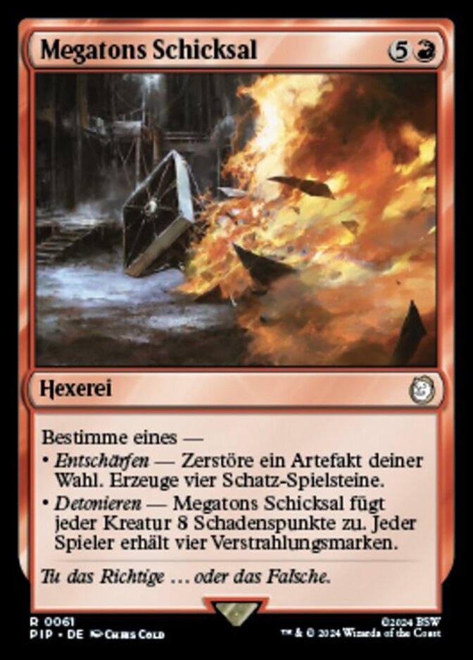 | Rules | Choose one — • Disarm — Destroy target artifact. Create four Treasure tokens. • Detonate — Megaton's Fate deals 8 damage to each creature. Each player gets four rad counters. |