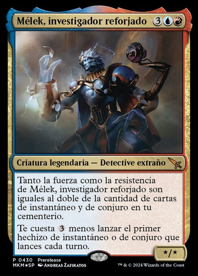 | Rules | Melek, Reforged Researcher's power and toughness are each equal to twice the number of instant and sorcery cards in your graveyard. The first instant or sorcery spell you cast each turn costs less to cast. |