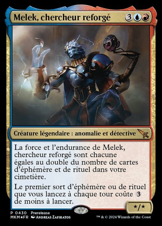 | Rules | Melek, Reforged Researcher's power and toughness are each equal to twice the number of instant and sorcery cards in your graveyard. The first instant or sorcery spell you cast each turn costs less to cast. |