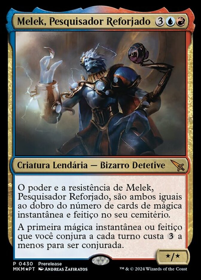 | Rules | Melek, Reforged Researcher's power and toughness are each equal to twice the number of instant and sorcery cards in your graveyard. The first instant or sorcery spell you cast each turn costs less to cast. |