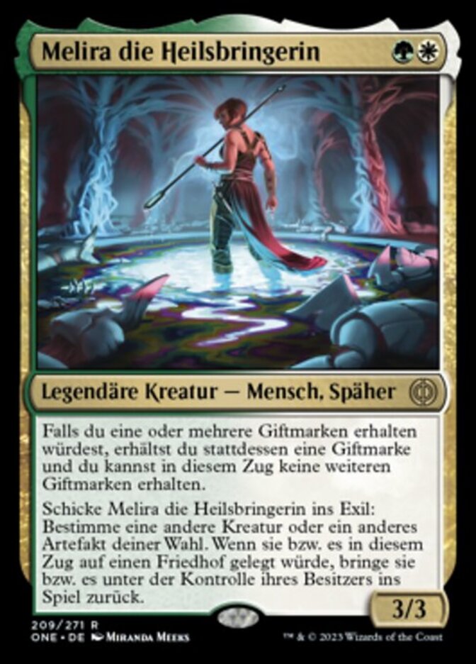 | Rules | If you would get one or more poison counters, instead you get one poison counter and you can't get additional poison counters this turn. Exile Melira, the Living Cure: Choose another target creature or artifact. When it's put into a graveyard this turn, return that card to the battlefield under its owner's control. |