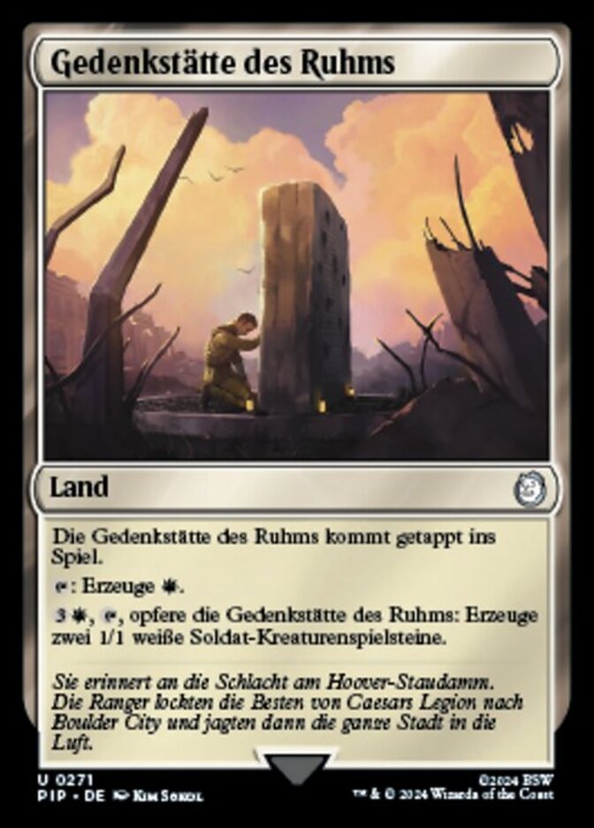 | Rules | Memorial to Glory enters the battlefield tapped. : Add . , , Sacrifice Memorial to Glory: Create two 1/1 white Soldier creature tokens. |