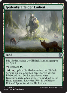 | Rules | Memorial to Unity enters the battlefield tapped. : Add . , , Sacrifice Memorial to Unity: Look at the top five cards of your library. You may reveal a creature card from among them and put it into your hand. Then put the rest on the bottom of your library in a random order. |