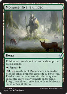 | Rules | Memorial to Unity enters the battlefield tapped. : Add . , , Sacrifice Memorial to Unity: Look at the top five cards of your library. You may reveal a creature card from among them and put it into your hand. Then put the rest on the bottom of your library in a random order. |