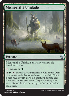 | Rules | Memorial to Unity enters the battlefield tapped. : Add . , , Sacrifice Memorial to Unity: Look at the top five cards of your library. You may reveal a creature card from among them and put it into your hand. Then put the rest on the bottom of your library in a random order. |