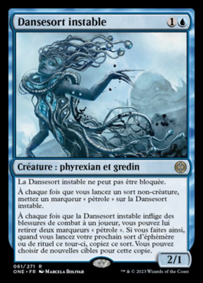 | Rules | Mercurial Spelldancer can't be blocked. Whenever you cast a noncreature spell, put an oil counter on Mercurial Spelldancer. Whenever Mercurial Spelldancer deals combat damage to a player, you may remove two oil counters from it. If you do, when you cast your next instant or sorcery spell this turn, copy that spell. You may choose new targets for the copy. |
