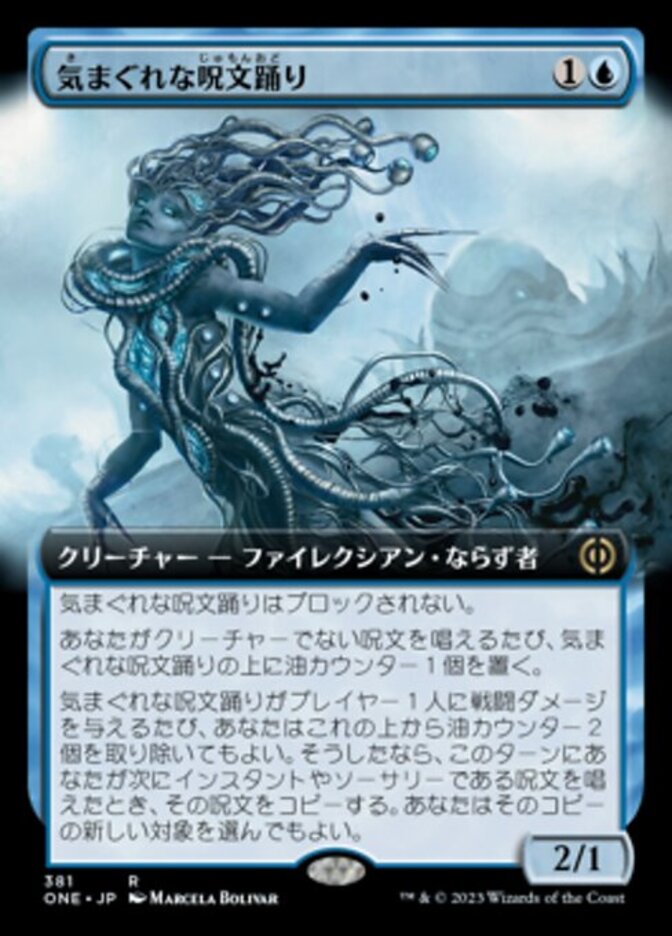 | Rules | Mercurial Spelldancer can't be blocked. Whenever you cast a noncreature spell, put an oil counter on Mercurial Spelldancer. Whenever Mercurial Spelldancer deals combat damage to a player, you may remove two oil counters from it. If you do, when you cast your next instant or sorcery spell this turn, copy that spell. You may choose new targets for the copy. |