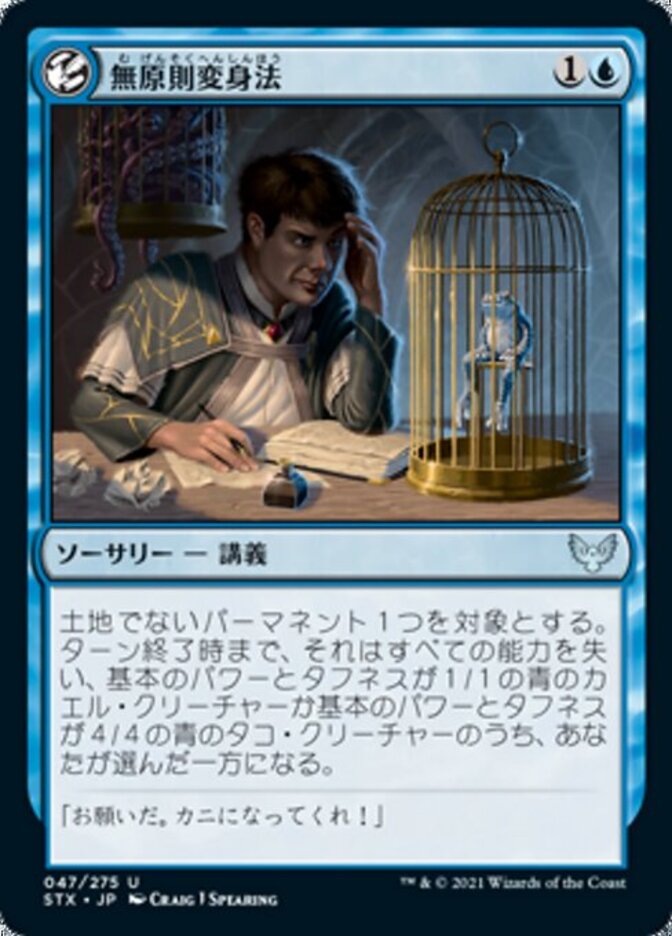 | Rules | Until end of turn, target nonland permanent loses all abilities and becomes your choice of a blue Frog creature with base power and toughness 1/1 or a blue Octopus creature with base power and toughness 4/4. |