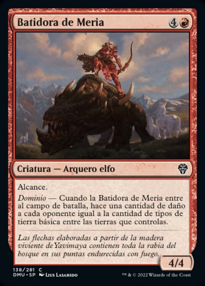 | Rules | Reach Domain—When Meria's Outrider enters the battlefield, it deals damage to each opponent equal to the number of basic land types among lands you control. |