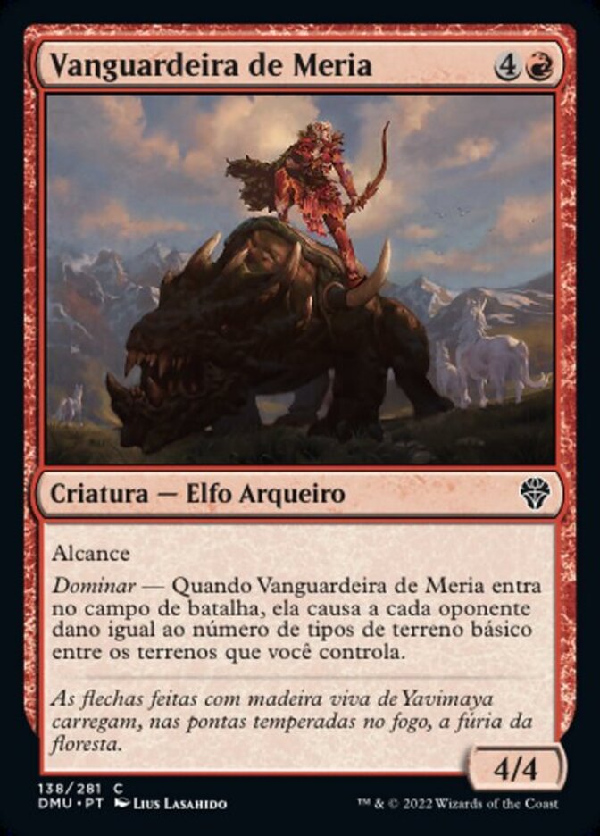| Rules | Reach Domain—When Meria's Outrider enters the battlefield, it deals damage to each opponent equal to the number of basic land types among lands you control. |