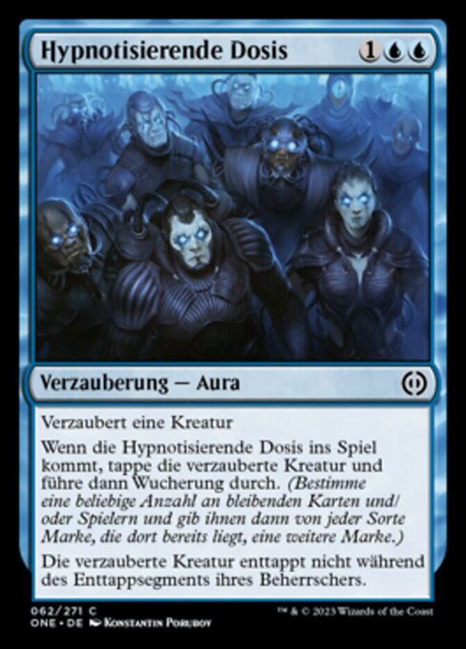 | Rules | Enchant creature When Mesmerizing Dose enters the battlefield, tap enchanted creature, then proliferate. (Choose any number of permanents and/or players, then give each another counter of each kind already there.) Enchanted creature doesn't untap during its controller's untap step. |