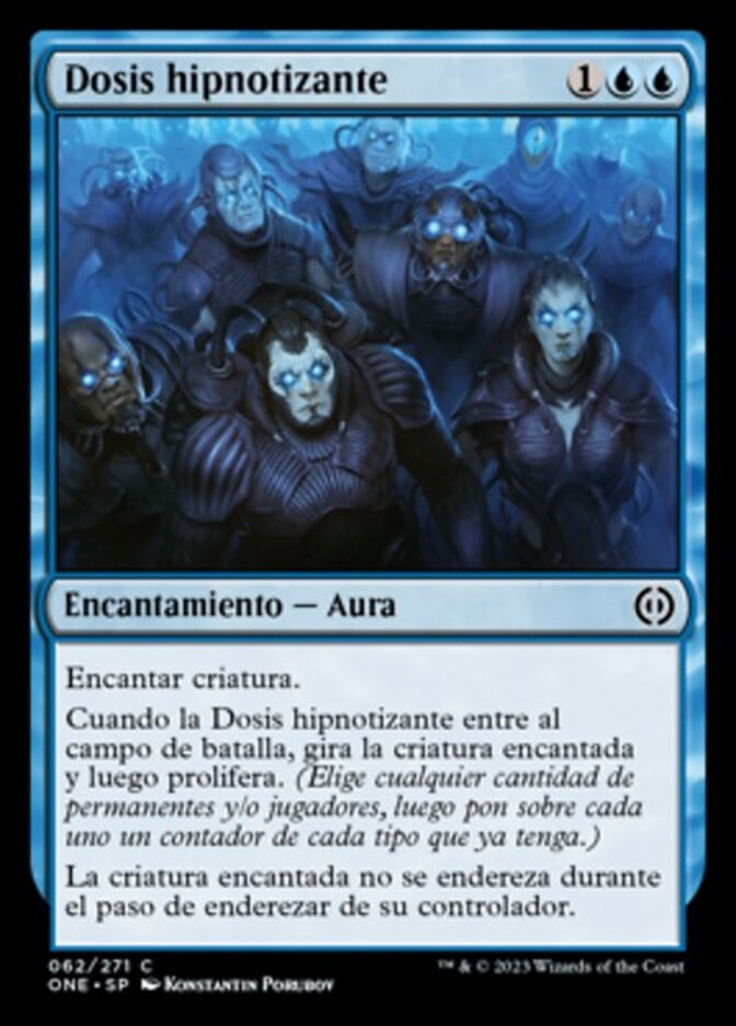 | Rules | Enchant creature When Mesmerizing Dose enters the battlefield, tap enchanted creature, then proliferate. (Choose any number of permanents and/or players, then give each another counter of each kind already there.) Enchanted creature doesn't untap during its controller's untap step. |