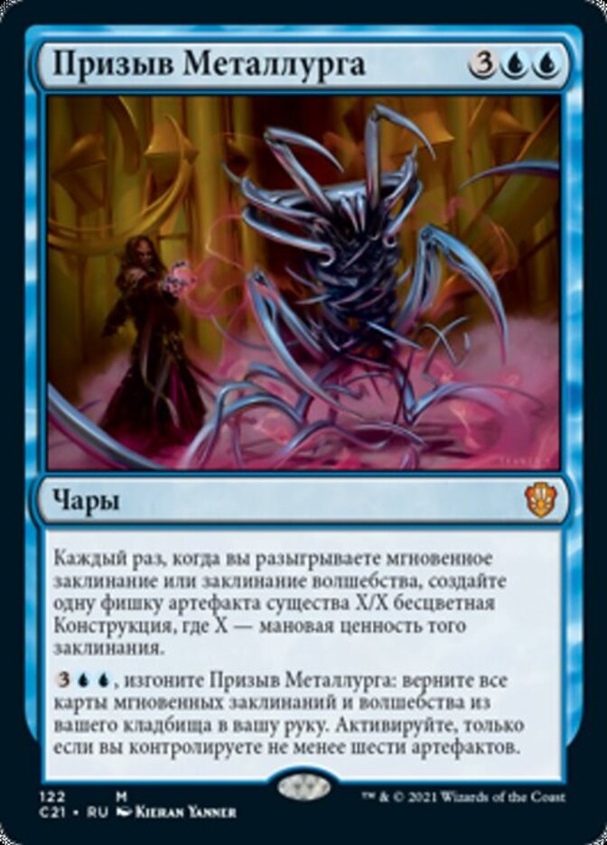 | Rules | Whenever you cast an instant or sorcery spell, create an X/X colorless Construct artifact creature token, where X is that spell's mana value. , Exile Metallurgic Summonings: Return all instant and sorcery cards from your graveyard to your hand. Activate only if you control six or more artifacts. |