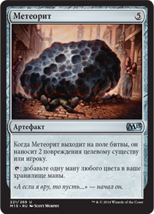 | Rules | When Meteorite enters the battlefield, it deals 2 damage to any target. : Add one mana of any color. |