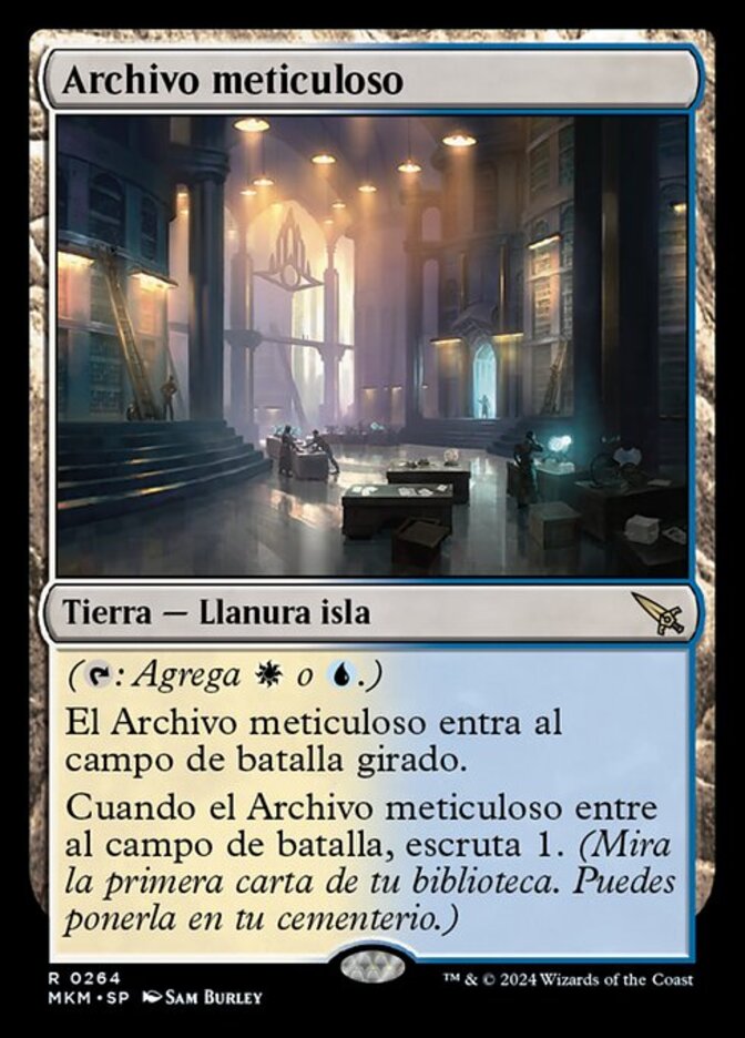 | Rules | (: Add or .) Meticulous Archive enters the battlefield tapped. When Meticulous Archive enters the battlefield, surveil 1. (Look at the top card of your library. You may put it into your graveyard.) |