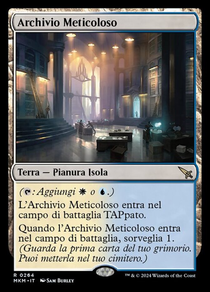 | Rules | (: Add or .) Meticulous Archive enters the battlefield tapped. When Meticulous Archive enters the battlefield, surveil 1. (Look at the top card of your library. You may put it into your graveyard.) |