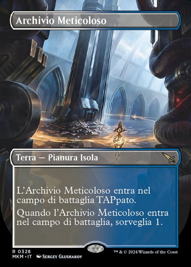 | Rules | (: Add or .) Meticulous Archive enters the battlefield tapped. When Meticulous Archive enters the battlefield, surveil 1. (Look at the top card of your library. You may put it into your graveyard.) |