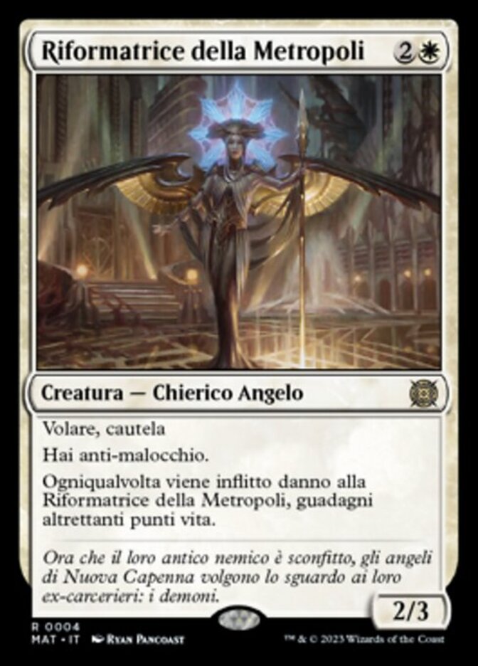 | Rules | Flying, vigilance You have hexproof. Whenever Metropolis Reformer is dealt damage, you gain that much life. |