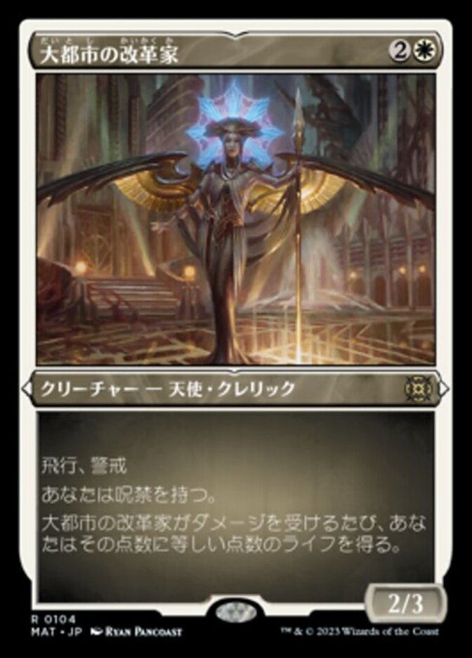 | Rules | Flying, vigilance You have hexproof. Whenever Metropolis Reformer is dealt damage, you gain that much life. |