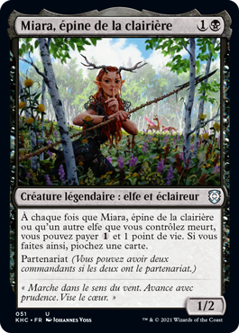 | Rules | Whenever Miara, Thorn of the Glade or another Elf you control dies, you may pay and 1 life. If you do, draw a card. Partner (You can have two commanders if both have partner.) |