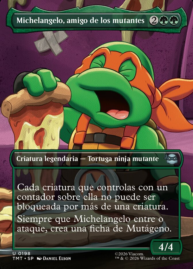 | Rules | Each creature you control with a counter on it can't be blocked by more than one creature. Whenever Michelangelo enters or attacks, create a Mutagen token. (It's an artifact with ", , Sacrifice this token: Put a +1/+1 counter on target creature. Activate only as a sorcery.") |