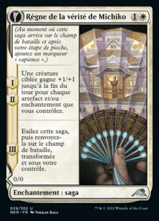 | Rules | (As this Saga enters and after your draw step, add a lore counter.) I, II — Target creature gets +1/+1 until end of turn for each artifact and/or enchantment you control. III — Exile this Saga, then return it to the battlefield transformed under your control. // Portrait of Michiko gets +1/+1 for each artifact and/or enchantment you control. |