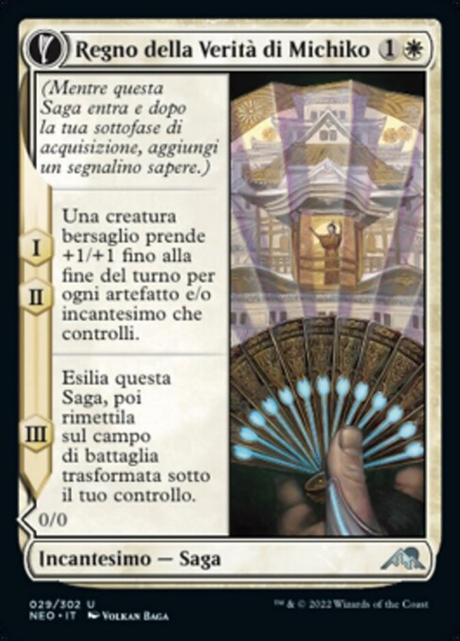 | Rules | (As this Saga enters and after your draw step, add a lore counter.) I, II — Target creature gets +1/+1 until end of turn for each artifact and/or enchantment you control. III — Exile this Saga, then return it to the battlefield transformed under your control. // Portrait of Michiko gets +1/+1 for each artifact and/or enchantment you control. |