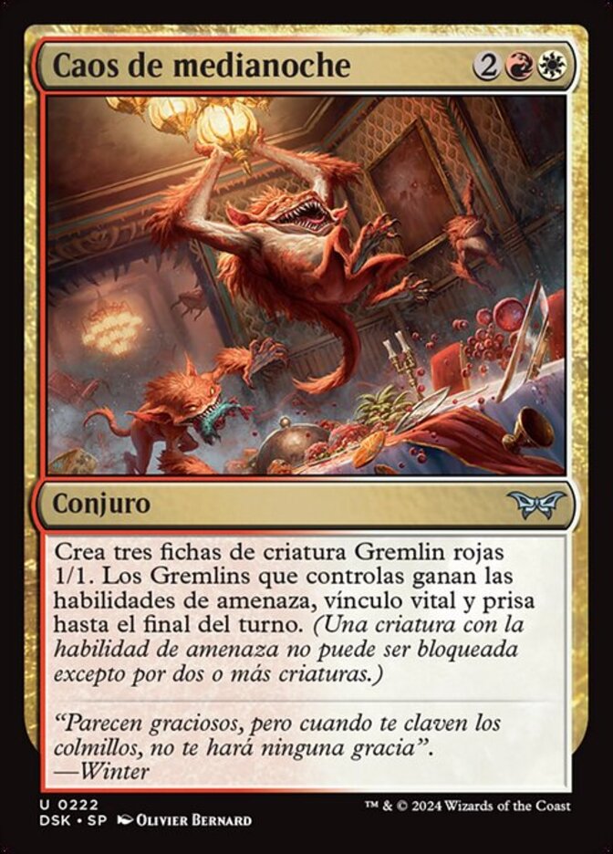 | Rules | Create three 1/1 red Gremlin creature tokens. Gremlins you control gain menace, lifelink, and haste until end of turn. (A creature with menace can't be blocked except by two or more creatures.) |
