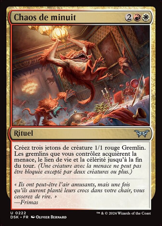 | Rules | Create three 1/1 red Gremlin creature tokens. Gremlins you control gain menace, lifelink, and haste until end of turn. (A creature with menace can't be blocked except by two or more creatures.) |