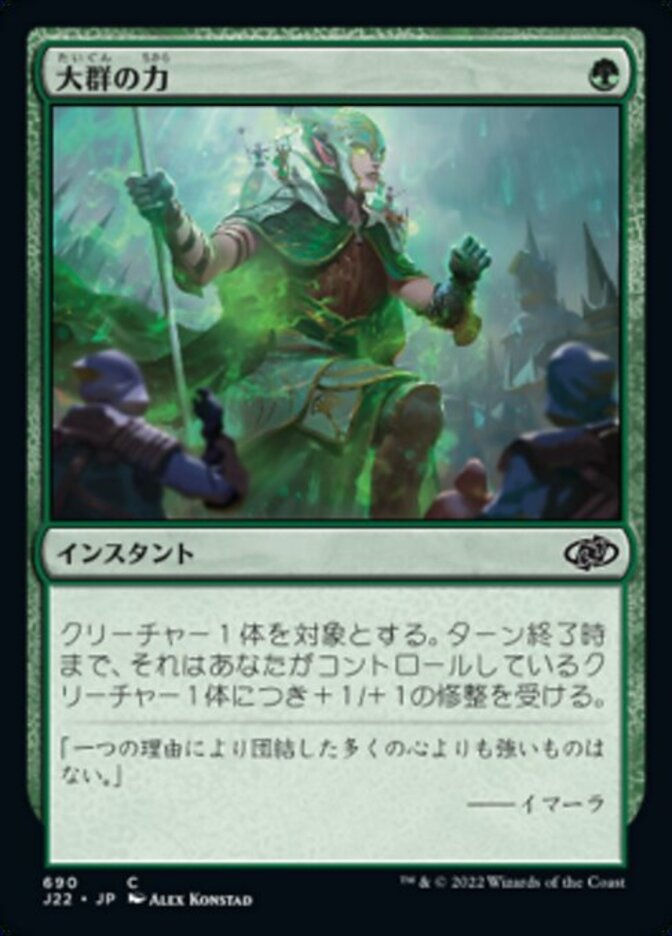 | Rules | Target creature gets +1/+1 until end of turn for each creature you control. |