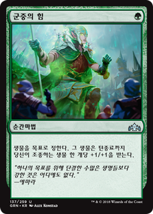 | Rules | Target creature gets +1/+1 until end of turn for each creature you control. |