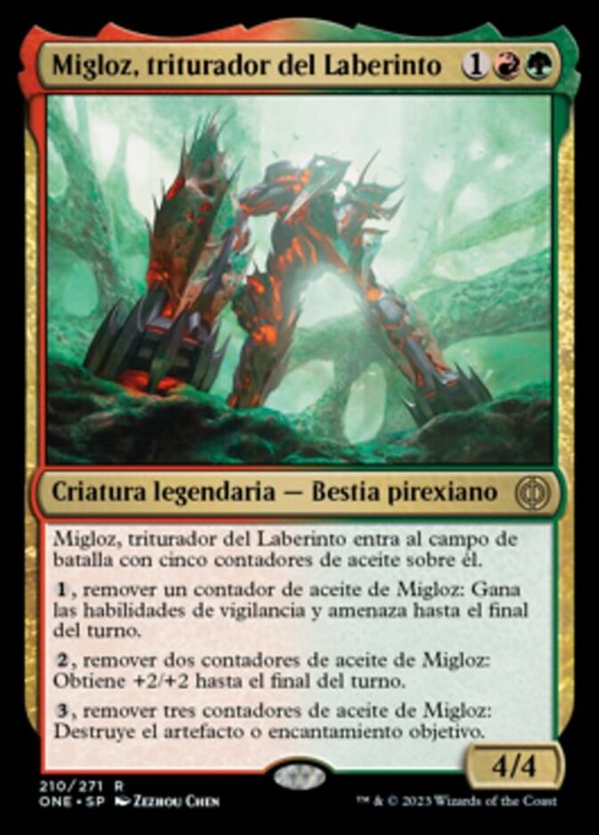 | Rules | Migloz, Maze Crusher enters the battlefield with five oil counters on it. , Remove an oil counter from Migloz: It gains vigilance and menace until end of turn. , Remove two oil counters from Migloz: It gets +2/+2 until end of turn. , Remove three oil counters from Migloz: Destroy target artifact or enchantment. |