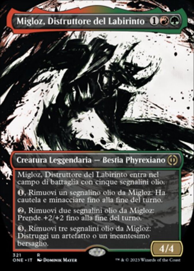 | Rules | Migloz, Maze Crusher enters the battlefield with five oil counters on it. , Remove an oil counter from Migloz: It gains vigilance and menace until end of turn. , Remove two oil counters from Migloz: It gets +2/+2 until end of turn. , Remove three oil counters from Migloz: Destroy target artifact or enchantment. |