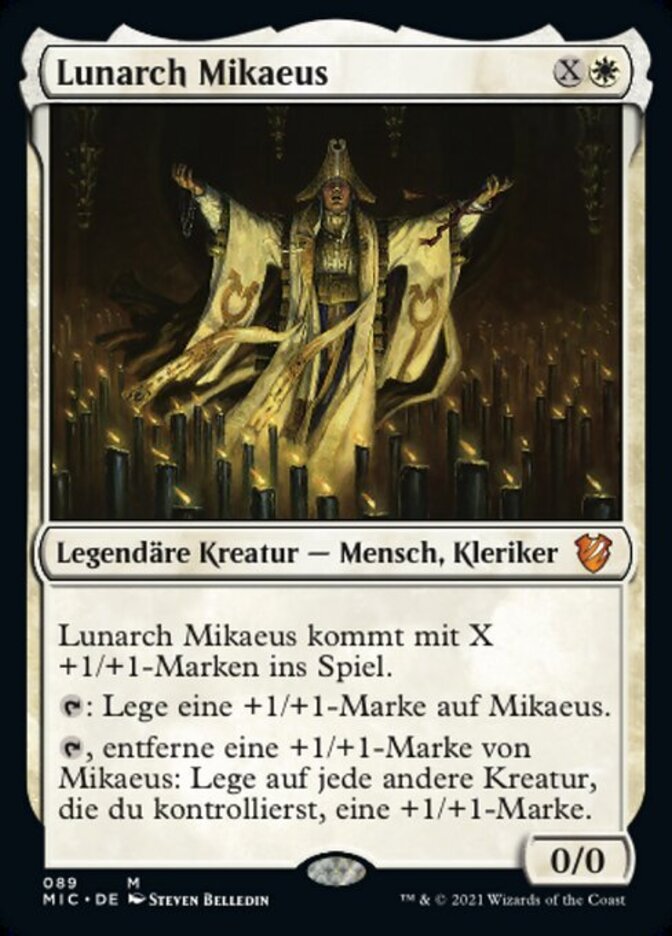 | Rules | Mikaeus, the Lunarch enters the battlefield with X +1/+1 counters on it. : Put a +1/+1 counter on Mikaeus. , Remove a +1/+1 counter from Mikaeus: Put a +1/+1 counter on each other creature you control. |