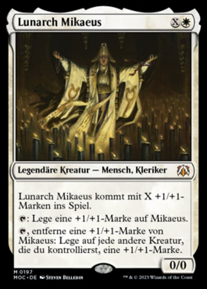 | Rules | Mikaeus, the Lunarch enters the battlefield with X +1/+1 counters on it. : Put a +1/+1 counter on Mikaeus. , Remove a +1/+1 counter from Mikaeus: Put a +1/+1 counter on each other creature you control. |