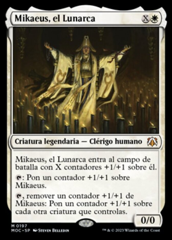 | Rules | Mikaeus, the Lunarch enters the battlefield with X +1/+1 counters on it. : Put a +1/+1 counter on Mikaeus. , Remove a +1/+1 counter from Mikaeus: Put a +1/+1 counter on each other creature you control. |
