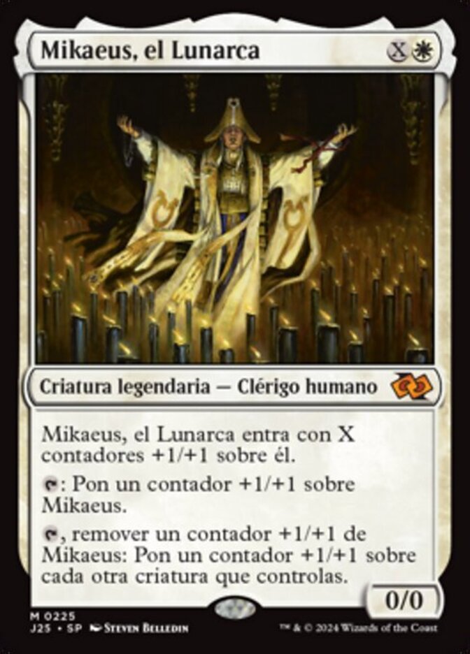 | Rules | Mikaeus, the Lunarch enters the battlefield with X +1/+1 counters on it. : Put a +1/+1 counter on Mikaeus. , Remove a +1/+1 counter from Mikaeus: Put a +1/+1 counter on each other creature you control. |