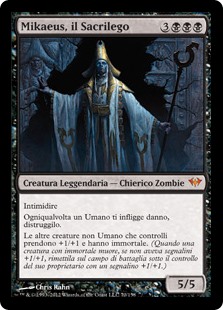 | Rules | Intimidate (This creature can't be blocked except by artifact creatures and/or creatures that share a color with it.) Whenever a Human deals damage to you, destroy it. Other non-Human creatures you control get +1/+1 and have undying. (When a creature with undying dies, if it had no +1/+1 counters on it, return it to the battlefield under its owner's control with a +1/+1 counter on it.) |