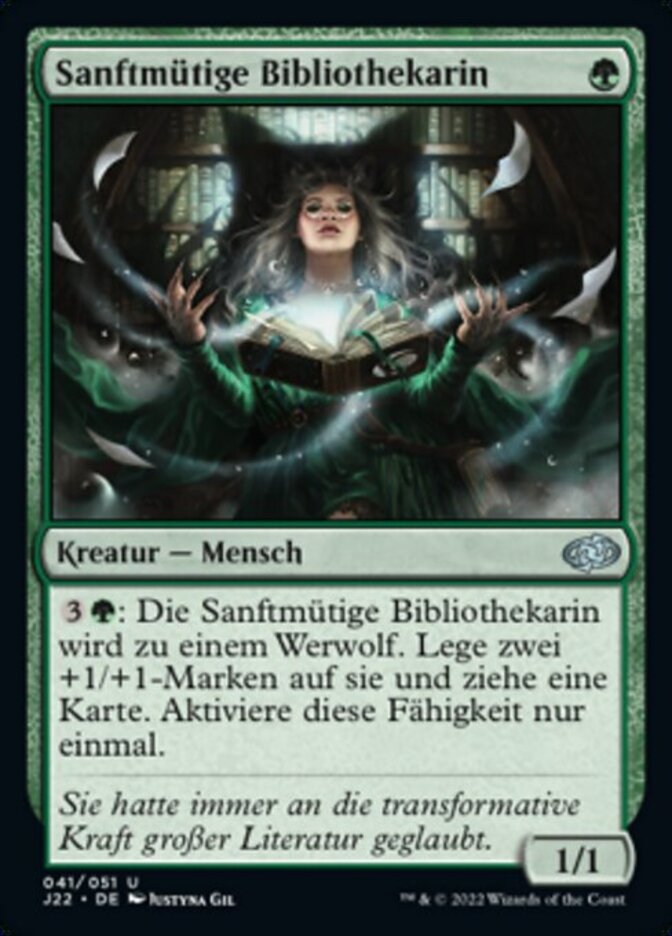 | Rules | : Mild-Mannered Librarian becomes a Werewolf. Put two +1/+1 counters on it and you draw a card. Activate only once. |