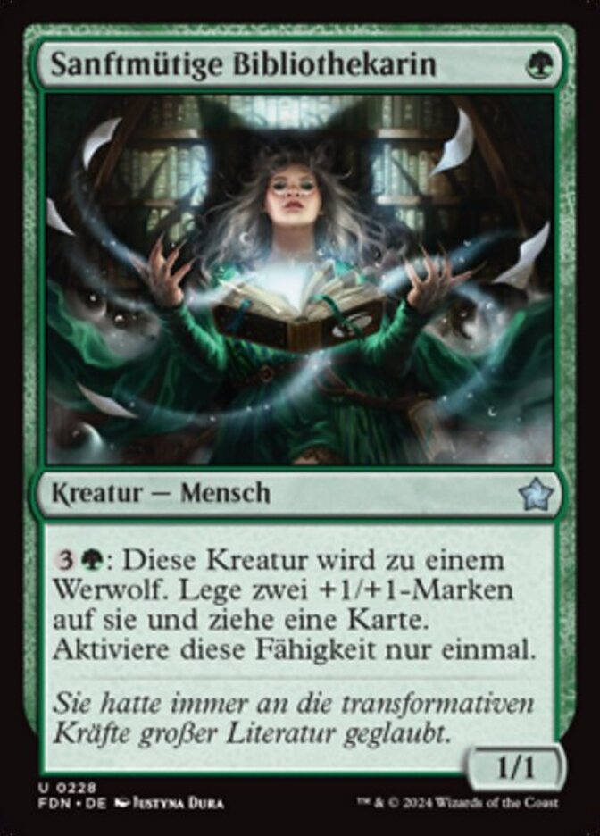 | Rules | : Mild-Mannered Librarian becomes a Werewolf. Put two +1/+1 counters on it and you draw a card. Activate only once. |