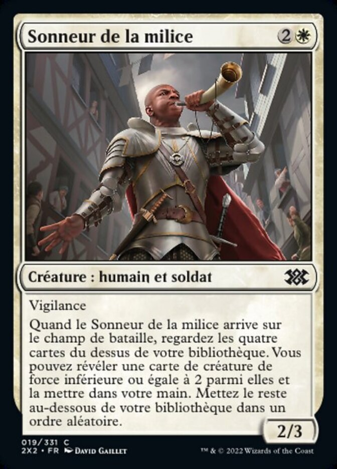 | Rules | Vigilance (Attacking doesn't cause this creature to tap.) When Militia Bugler enters the battlefield, look at the top four cards of your library. You may reveal a creature card with power 2 or less from among them and put it into your hand. Put the rest on the bottom of your library in a random order. |