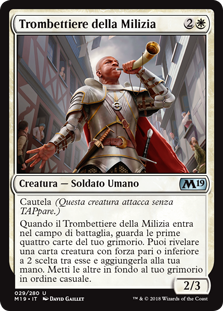 | Rules | Vigilance (Attacking doesn't cause this creature to tap.) When Militia Bugler enters the battlefield, look at the top four cards of your library. You may reveal a creature card with power 2 or less from among them and put it into your hand. Put the rest on the bottom of your library in a random order. |