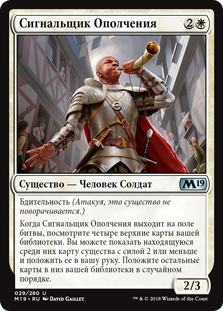 | Rules | Vigilance (Attacking doesn't cause this creature to tap.) When Militia Bugler enters the battlefield, look at the top four cards of your library. You may reveal a creature card with power 2 or less from among them and put it into your hand. Put the rest on the bottom of your library in a random order. |