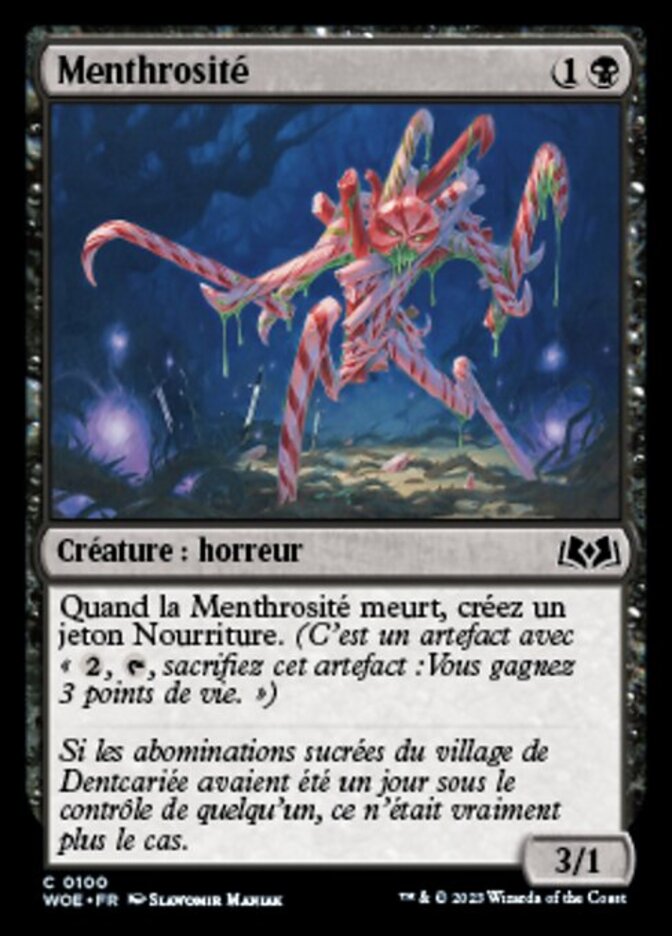 Rules When Mintstrosity dies, create a Food token. (It's an artifact with ", , Sacrifice this artifact: You gain 3 life.")