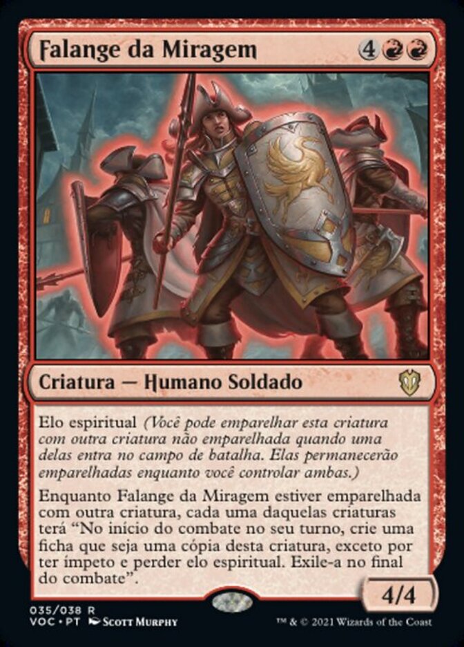 | Rules | Soulbond (You may pair this creature with another unpaired creature when either enters the battlefield. They remain paired for as long as you control both of them.) As long as Mirage Phalanx is paired with another creature, each of those creatures has "At the beginning of combat on your turn, create a token that's a copy of this creature, except it has haste and loses soulbond. Exile it at end of combat." |