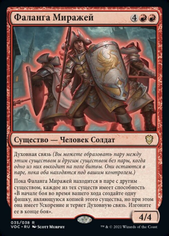 | Rules | Soulbond (You may pair this creature with another unpaired creature when either enters the battlefield. They remain paired for as long as you control both of them.) As long as Mirage Phalanx is paired with another creature, each of those creatures has "At the beginning of combat on your turn, create a token that's a copy of this creature, except it has haste and loses soulbond. Exile it at end of combat." |