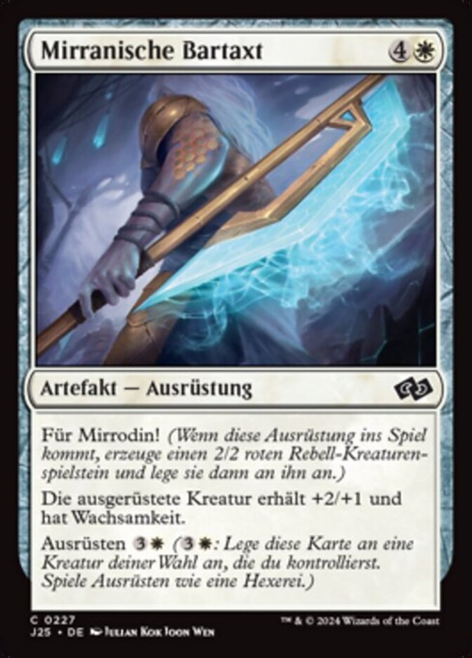 | Rules | For Mirrodin! (When this Equipment enters the battlefield, create a 2/2 red Rebel creature token, then attach this to it.) Equipped creature gets +2/+1 and has vigilance. Equip (: Attach to target creature you control. Equip only as a sorcery.) |