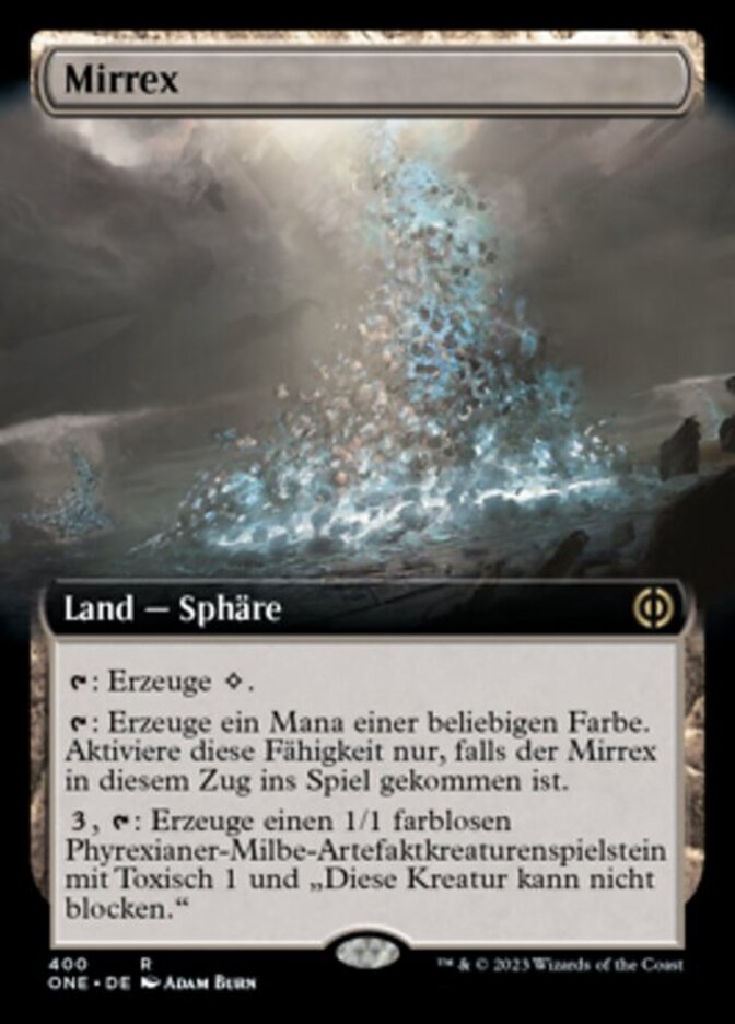 | Rules | : Add . : Add one mana of any color. Activate only if Mirrex entered the battlefield this turn. , : Create a 1/1 colorless Phyrexian Mite artifact creature token with toxic 1 and "This creature can't block." (Players dealt combat damage by it also get a poison counter.) |